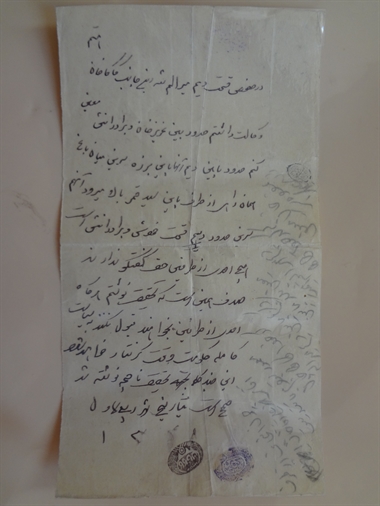 سند مربوط به تعیین حدود املاک مرحوم عزیزخان اقبالی و پسر عموها در منطقه میر علمشاه با میانجیگری مرحوم کدخدا کاکاخان